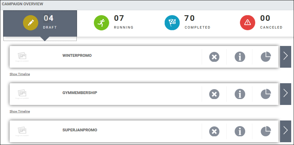 ● By default DRAFT campaigns are listed; click one of the other types (for example, RUNNING) to review those campaigns.