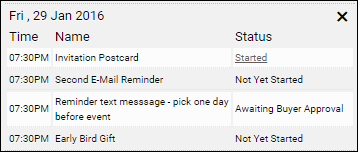 ● If you click a circle, a small window opens. If the Status of an activity is Started, you can click Started to open the Order Confirmation page. If an activity is waiting for your approval, you can open the campaign, click Launch, and complete the necessary action (typically you click Add to Cart and pay for the activity.)