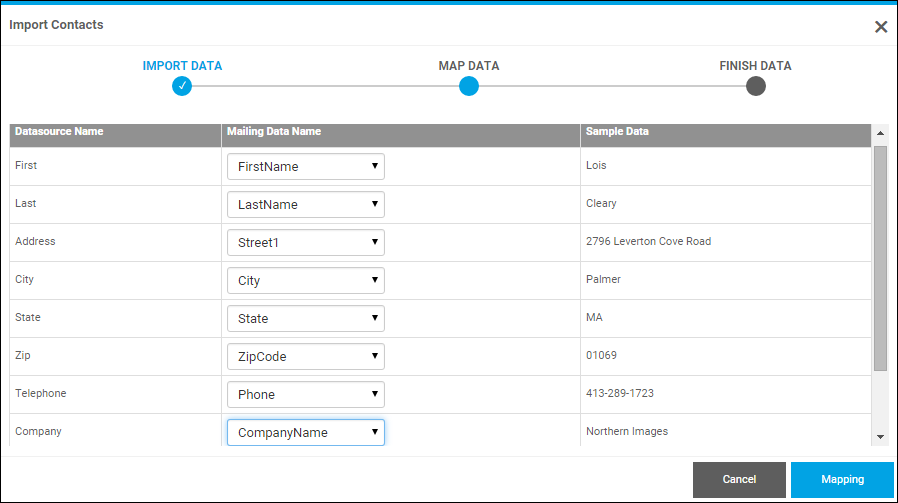 7. After you click Import, map fields in your contact list to fields (name, address, city, and so on) that are required for mailing any printed materials that are part of the CMM campaign. The Datasource Name column lists the names of the fields in your contact list; the Mailing Data Name column lists the names of the fields required to mail printed materials. Select the correct matching fields in the Mailing Data Name column. (Some fields may be matched automatically if their names are similar.)