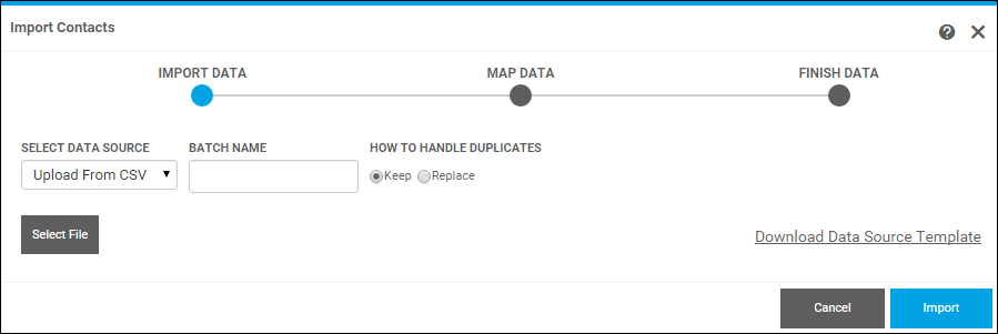 1. If you plan to import contacts from a CSV file and are not sure what kind of data you must supply, click Download Source Template. A file named DSMxContactUpload.csv is saved in your Downloads folder. You can use this file as the basis for your own CSV file.