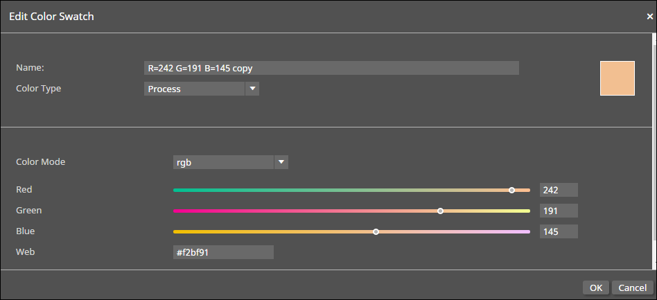 Note: As you use the sliders, the numeric values are updated automatically, and vice versa. The Web (RGB) color value is also updated when you specify Red, Green, or Blue values.